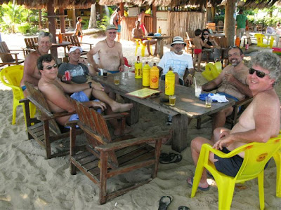 Antes de contar confidências que deram origem ao título desta postagem, vou descrever rapidamente o nosso último dia de Bike no Sul da Bahia. Saímos cedo de Arraial, neste sábado dia 18 de outubro, e atravessamos de balsa o Rio Buranhém até Porto Seguro. Foram 4 horas de pedalada (ida e volta) por estrada até Santa Cruz Cabrália, com pit stop nas barracas de praia. De tarde, fomos à praia de Mucugê para tomar cerveja e caipirinha com isca de peixe. Uma morena ao lado fez tererê nos cabelos e inspirou alguns de nossos companheiros. Olavo, claro, foi um dos que entraram na onda. Notem que ele também está de colar e pulseira (a tornozeleira, também de contas e buzios, não aparece na foto). Mas ninguém esperava que a epidemia de desbunde pegasse o nosso machão de Bagé, gaúcho de quatro costados, o Ivan! O homem ficou louco – nem o pouco cabelo foi problema. Entusiasmado, entrou também “numas” de tatuagem. No braço e na perna!!! “O que eu vou contar lá em casa?” Em Sampa e, pior, lá nos pampas gaúchos. E ele só toma coca-cola. Foi divertido. Agora estamos na pousada, com vista para o Atlântico. Amanhã voltaremos para São Paulo. A semana da criança acabou. Beijos e abraços a todos que acompanharam a nossa viagem e até o próximo ano, que terá uma programação bem diferente: Vale do Loire, na França. Que parte da cultura local irá influenciar o comportamento de nossos ciclistas? Não quero nem pensar. Tchau!